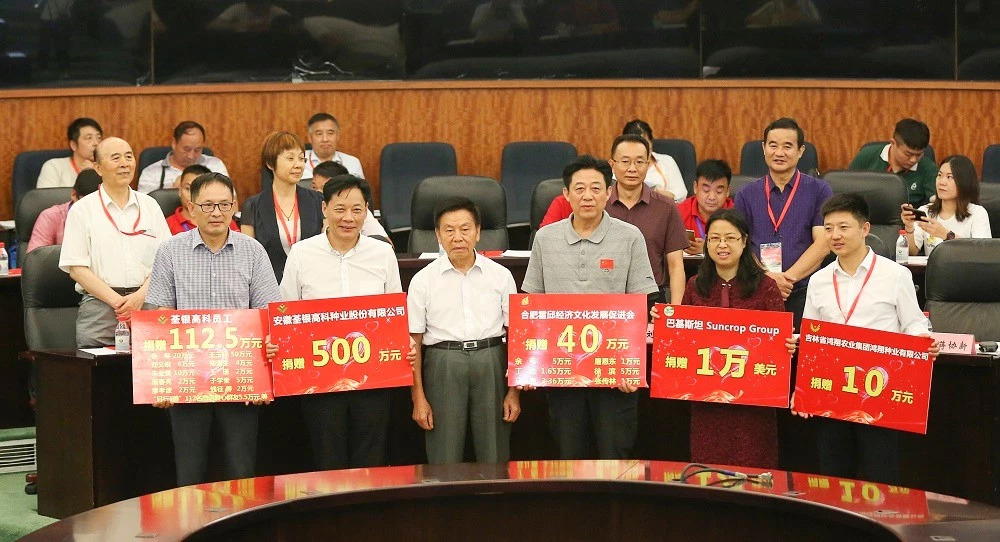 會上進行了基金會2018年公益愛心捐贈儀式。荃銀高科母子公司高管和員工多次參與基金會濟困助學公益慈善活動,本次捐贈112.5萬元;吉林鴻翔種業集團鴻翔種業有限公司捐贈10萬元;巴基斯坦Suncrop Group(陽光作物集團)捐贈1萬美元;合肥霍邱經濟文化發展促進會及會員為基金會貧困助學項目捐贈40萬元;安徽荃銀高科種業股份有限公司捐贈500萬元。