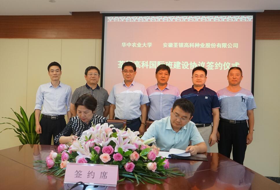 ??? 2019年8月12日,華中農業大學校黨委常委、組織部長李向東,植物科學技術學院黨委書記周雄,植物科學技術學院院長嚴建兵一行蒞臨荃銀高科,雙方簽署荃銀高科國際合作班建設協議并座談交流,荃銀高科副董事長、總經理張琴,副總經理、首席技術官、荃銀農科院院長張從合,副總經理朱全貴等領導熱情接待了李向東常委一行。