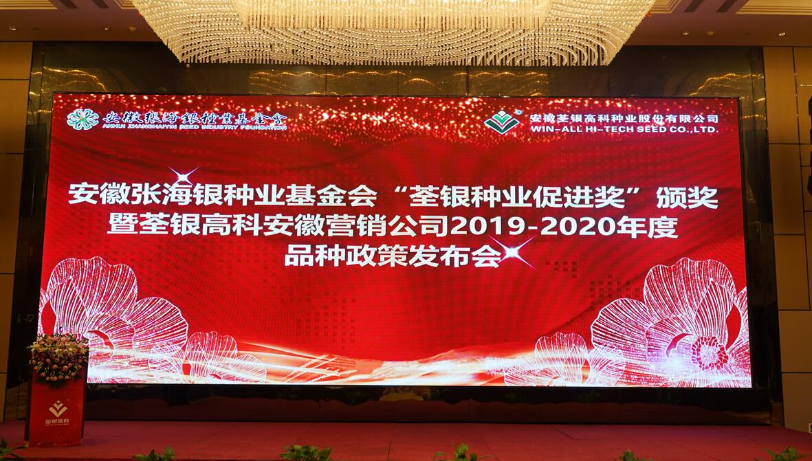 ??? 深耕種業(yè),不忘初心。8月19-20日,安徽張海銀種業(yè)基金會2019年“荃銀種業(yè)促進獎”頒獎大會暨荃銀高科安徽營銷公司品種政策發(fā)布會在安徽蕪湖隆重召開。安徽省種子管理總站副站長劉根、中國貿(mào)促會蕪湖市支會會長常拯、蕪湖市種子管理站副站長陳煒平、安徽荃銀高科種業(yè)股份有限公司副董事長兼總經(jīng)理張琴、常務(wù)副總經(jīng)理兼營銷總監(jiān)王玉林、安徽張海銀種業(yè)基金會秘書長張彤、建設(shè)銀行、益海嘉里等單位相關(guān)領(lǐng)導(dǎo)及安徽、江蘇、河南等省近200位種業(yè)精英們參會。